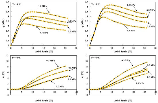 Stress–strain responses from triaxial test under −4 and −6 °C freezing temperatures, reproduced from Xu (2014) [20].