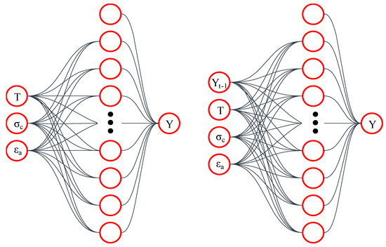 The considered input combinations for the model development involved the antecedent deviatoric stress and volumetric strains, denoted by q(t−1) and εv(t−1), respectively; axial strain (εa); confining pressure (σc); and freezing temperature (T). Note that q(t−1) and εv(t−1) are both a common variable of any constitutive model. However, these two can also be omitted, and another independent model can also be developed. At present, there is a wide variety of input parameters and frameworks employed in machine learning-based constitutive modeling, and there exists no established methodology or guidance for selecting these parameters and frameworks [12]. Both input combination cases were categorized as case 1 and case 2, representing the inclusion and exclusion of the antecedent target value in the models.