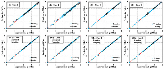 The outputs of the models are depicted in Figure 9, Figure 10, Figure 11, Figure 12, Figure 13, Figure 14, Figure 15 and Figure 16 in the form of deviatoric stress and volumetric strain along with axial strain. Training and testing in these stress–strain curves are shown in filled and hollow markers, respectively.