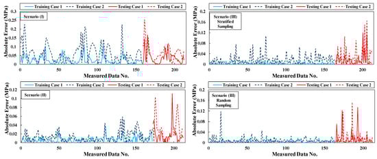 Figure 6 and Figure 7 illustrate the absolute errors between predicted and measured values (q and εv, respectively) for each data point in the training and testing sets. Additionally, Figure 8 presents the mean absolute error (MAE) for the testing data of each developed model. Figure 6 and Figure 8a reveal larger errors in predicted deviatoric stress for scenario (I) compared to other models in both cases 1 and 2. Additionally, both stratified and random sampled data point models for q estimation exhibited greater errors than scenario 2 within the same case class. Moreover, Figure 7 and Figure 8b demonstrate greater accuracy for εv predictions using scenario (II). Outstandingly, excluding the antecedent target value (Yt−1) in case 2 of scenario (I) resulted in the least accurate model, which can be clearly seen in Figure 8b.