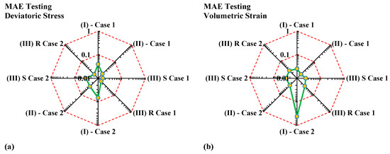 Testing division MAE of the developed models for (a) deviatoric stress and (b) volumetric strain.
