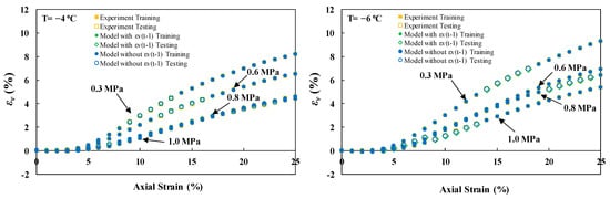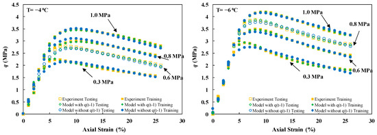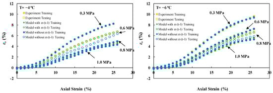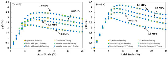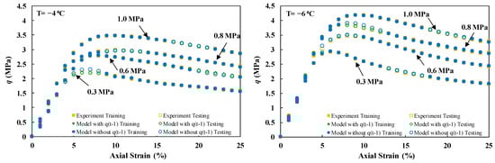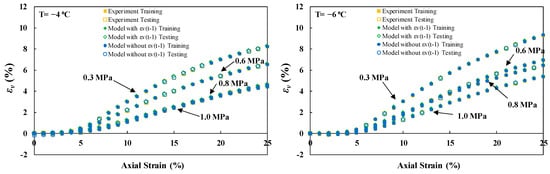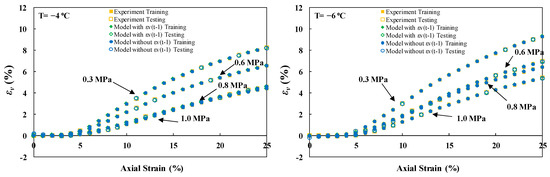 This study examined three distinct scenarios for model testing. Scenario (I) involved keeping individual experiments unseen, scenario (II) entailed setting aside sections of each stress–strain curve, and scenario (III) comprised sampling data points. Scenario (I) imposed the most rigorous condition, where the model was expected to predict an individual experiment based on its training on other physical states of experiments. In this scenario, confining pressures of 0.6 and 0.8 MPa at freezing temperatures of −4 and −6, respectively, were kept unseen as the test set. Since no previous data were presented to the model under these conditions, the lower accuracy compared to other modeling strategies can be justified. Moreover, stratified data sampling in models involving Yt−1 led to improved accuracies compared to random point sampling.