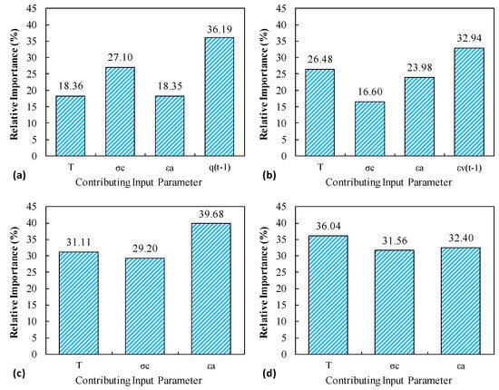 As presented in Figure 17a,b, the Yt−1, which is the antecedent deviatoric stress or volumetric strain, is the most influential contributing parameter, with the importance of 36.18% and 32.93%, respectively. However, in the case 2 model of deviatoric stress prediction, axial strain is the most effective input variable in the model, with 39.68%, and the least effective input is the confining pressure, with an importance of 29.2%. For the model of volumetric strain prediction in case 2, the temperature is the most influential parameter, with a 36.03% effect on the response, and the least effective parameter is the confining pressure, with a 31.56% influence on the target. It can be observed that out of all the input variables involved in the model, none of them were over- or underrated in the trained models.