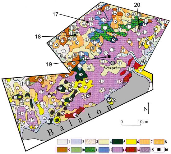 Geology of the Bakony Mountains []. Legend: 1. Fluvial sediment. 2. Holocene peat. 3. Holocene moving sand. 4. Pleistocene loess. 5. Pliocene basalt. 6. Upper-Miocene freshwater limestone. 7. Middle-Miocene limestone. 8. Oligocene gravel. 9. Eocene limestone. 10. Upper-Cretaceous limestone. 11. Lower-Cretaceous limestone. 12. Jurassic limestone. 13. Triassic limestone. Dolomite; 14. Permian sandstone. 15. Early Palaeozoic phyllites. 16. Research areas. 17. Eleven-Förtés. 18. Mester-Hajag North. 19. Homód Valley. 20. Tés Plateau East.