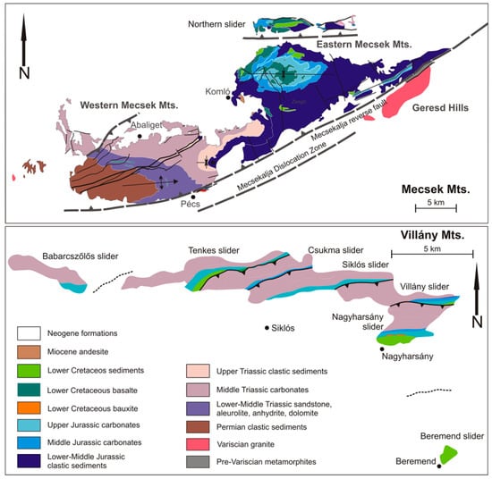 Simplified geological map of Mecsek and Villány Mts []. Legend is given in figure.