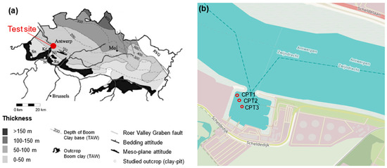 (a) The Boom clay formation in Belgium, with its depth and thickness (after ONDRAF/NIRAS [3]). The location of the test site and (b) CPT location (source: www.OpenStreetMap.org).