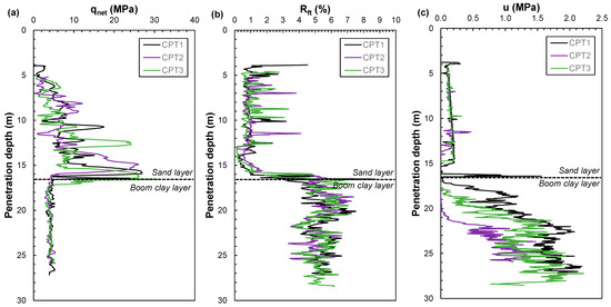 In situ testing included three cone penetration tests (CPT1, CPT2, CPT3) and three boring drillings adjacent to the sites of the CPTs for material sampling (B1, B2, B3). The locations of the CPT sites are given in Figure 1b. The stratigraphy of the test sites, as identified from the in situ tests, indicates the presence of a sand layer on top of the Boom clay layer. The latter is encountered at about 16.5 m below ground level. The net cone tip resistance, qnet, and the corrected friction ratio, Rft, of the CPTs are calculated based on Equations (1) and (2), respectively [20], and are plotted against the penetration depth in Figure 2. In the Boom clay layer, the corrected cone resistance and friction ratio are approximately 4 MPa and 5.5%, respectively.