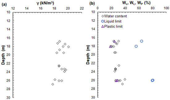 The in-depth distribution of the following: (a) bulk unit weight, γ, and (b) water content, Wc; liquid limit, WL; and plastic limit, WP, for the tested Boom clay.