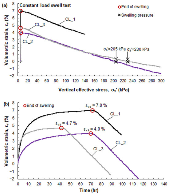 The development of volumetric strain, εv, with the following: (a) vertical effective stress, σv′, and (b) time from the start of testing. Constant load (CL) swell tests on Boom clay samples.