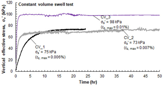 The results of the constant load and constant volume swell tests showing the development of effective vertical stress and volumetric strain with time are shown in Figure 4 and Figure 5, respectively. The swelling pressures measured from the triaxial, CV and CL tests are plotted for comparison in Figure 6 together with the swelling pressure as this is estimated based on Equation (4) for K0 values of 0.5 and 1.0. It should be pointed out that previous laboratory investigations into Boom clay at the Mol site indicated that the values for K0 in the normally consolidated condition were between 0.5 and 0.8 [7,36]. At the same site, in situ K0 measurements at a depth of about 223 m had some scatter in terms of K0 values: K0 = 0.3–0.9 [10]. To the authors’ knowledge, field measurements of in situ K0 values for Boom clay at shallow depths have not been reported in the literature.