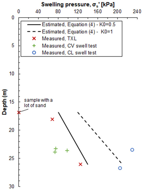 The constant volume swell pressure appears to fit the swelling pressure from triaxial tests better. On the other hand, the constant load swell pressure is about 2.5 times higher than the constant volume swell pressure. In fact, Thompson et al. [21] showed that the constant volume swell pressure can be approximately one-third of the constant load swell pressure. The data in Figure 6 show that the Boom clay samples retrieved from a depth of 16.9–26.8 m below ground level exhibit swelling tendencies, the magnitude of which, however, depends on the measurement procedure applied and the imposed stress paths. The dependency of the swelling pressure on the testing method was also emphasized by Reiffsteck et al. [37]. Nagaraj et al. [38] suggested that the constant load (CL) swell method allows for a completely swollen condition and provides a better estimation of swelling pressure compared with the constant volume (CV) method. In addition, since the K0 value was not determined experimentally, it is difficult to make any direct comparisons between the measured swelling pressures and the in situ state of stress. Nevertheless, the data in Figure 6 show that when testing Boom clay samples, it is important to take precautions before placing the samples in contact with water [39,40]. As illustrated in Figure 4b, for the tested samples, the release of swell pressure results in a volumetric strain of 4–7%.
