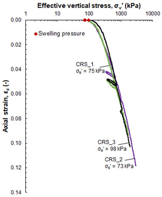At the end of the CV tests, as shown in Figure 5, the samples were subjected to constant rate of strain, CRS, testing. The consolidation curves obtained are shown in terms of axial strain, εz, versus vertical effective stress, σv′, in Figure 7. Loading started from the swell pressure measured at constant volume and consisted of six loading steps: loading to 4 × σvi′ (step A), followed by unloading to 2 × σvi′ (step B), reloading to 6 × σvi′ (step C), relaxation for 16 h (step D) and reloading to a maximum compression stress of about 10–15 times the estimated in situ effective vertical stress, σvi′ (step E). The applied deformation rate, dh/dt, was 0.03 mm/h, which corresponds to approximately 0.15%/h. This deformation rate resulted in the development of an excess pore water pressure at the base of the samples of less than 1.5% of the applied vertical stress.