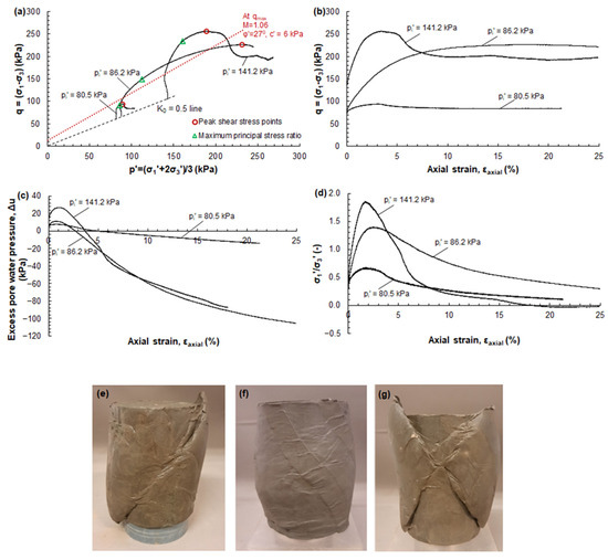 The samples appear to have approached the critical state with the deviator stress reaching a plateau in Figure 8b. Peak and strain softening are observed for two of the samples, while for one of the samples, an almost continuous increase in strength with increasing strain is recorded. The sample with the lowest initial mean effective stress, pi′, is also the sample which exhibits the lowest level of mobilized shear strength, although the differences in the pi′ values of the tested samples are not large. Visual observations of the deformation shape of the samples at the end of shearing show that for the samples with strain softening, shear planes develop [Figure 8e,g], whereas the sample that shows no strain softening response fails in a bulging mode [Figure 8f]. A best fit line was drawn through the peak stress points in Figure 8a. A mobilized friction angle of φ′ = 270 and a mobilized cohesion c′ = 6 kPa were determined from the slope and intercept of this line as given by Equations (6) and (7).