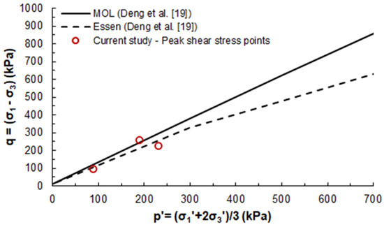 Alternatively to defining failure at peak shear stress, the points at which the principal stress ratio reaches a maximum are shown in Figure 8a. The best fit line through these points, however, shows a negative value for cohesion. Obviously, the number of triaxial tests performed herein is limited, which hinders the accurate determination of the friction angle and cohesion. Consequently, the φ′ and c′ values provided in this study should be regarded as preliminary and are subject to refinement as further data become available.