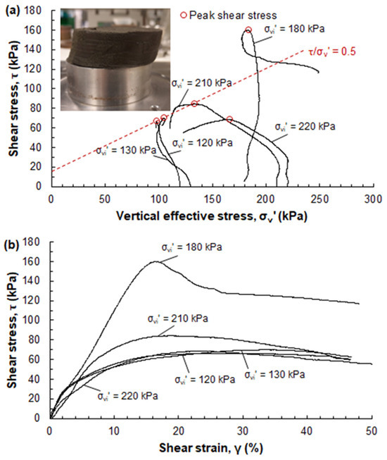 The failure envelope corresponding to peak shear stress points is also shown in Figure 10a. The failure envelope has a cohesion intercept of c′ = 17 kPa and a slope τ/σv′ = 0.5. The angle of internal friction φ′ is estimated to be 26.5°. Outliers in this estimation are the peak shear stress points of the DSS tests at σvi′ = 180 and 220 kPa.