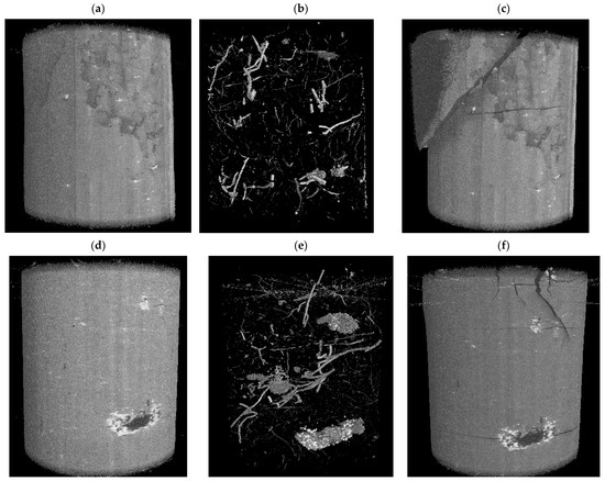Three-dimensional reconstruction images of the surface of the Boom clay samples: (a,d) prior to and (c,f) after UCS testing; (b,e) the 3D reconstruction of the inclusions inside the samples. X-ray μCT scans on samples UCS_1 and UCS_2.