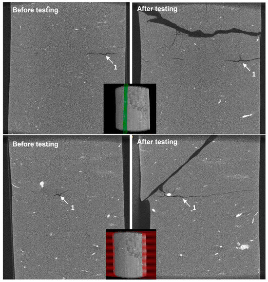 X-ray μCT vertical sections of sample UCS_1 before and after UCS testing. The arrows show discontinuities on the intact and sheared sample.