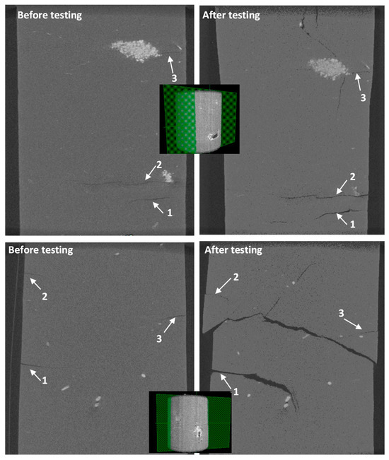 X-ray μCT vertical sections of sample UCS2 before and after UCS testing. The arrows show discontinuities on the intact and sheared sample.