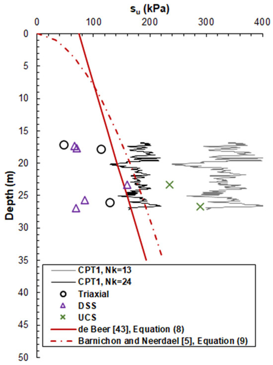The typical values of Nk for Boom clay reported in the literature are in the range of 13–24. These Nk values were applied in Equation (8) to determine the undrained shear strength for CPT1 given in Figure 14. In order to keep this figure clear, only the profile for CPT1 is plotted. As can be seen in Figure 2, all available CPTs show similar results. For the UCS tests, the undrained shear strength is taken to be equal to one-half of the unconfined compressive strength [46].