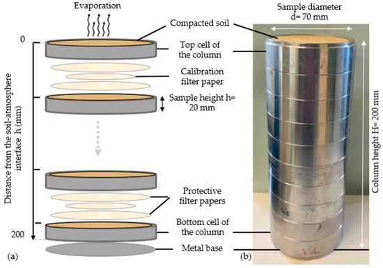 A series of dry filter papers (Whatman 42, Cat No. 1442-055) protected by a pair of larger filter papers (Whatman 42, Cat No. 1442-090), (all sourced from GE Healthcare Life Sciences, Little Chalfont, UK), were interposed between the samples (Figure 1a). Regularly weighing the filter papers allows to monitor the soil matric suction profiles Ψh (h meaning the distance to the interface). After assembling the column, it was sealed for hydraulic equilibrium for at least 24 h at 20 ± 1 °C.
