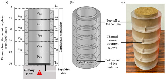 For non-isothermal test, column 3 was placed on a Decagon Temperature homogenization plate capable of controlling temperature in the range of −10 to 90 °C ± 1 °C. A sapphire disk with a diameter of 36.4 mm was placed at the bottom of the column for optimal heat conduction. Local temperature values were measured using Thermocouples sensors (RS Pro type K, 1/0.2 mm in diameter, ±1.5 °C precision) inserted between the cells on top of the calibration filter papers (T15; T30; T45; T60) (Figure 2a). One additional sensor measured the ambient air temperature (T0), while a second one monitored the temperature at the base of the column (T75) (between the sapphire disk and the heating plate), and a third sensor was placed directly on the heating plate to ensure its temperature stability. These sensors were connected to a computer system which allowed them to record and monitor the temperature in real time.