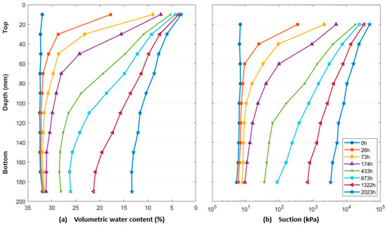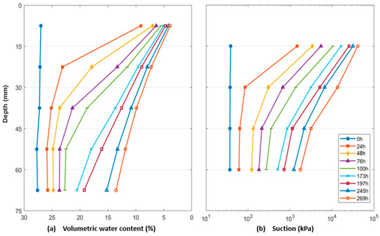 At 20 °C, water transfer is solely controlled by surface evaporation. The drying is progressive, starting from the top down to the base of the column. The deeper layers retain higher moisture content for a longer period and only begin to be affected after about 70 h of drying. This phenomenon varies in intensity depending on the distance from the soil–atmosphere interface (Figure 10a).