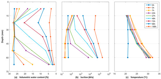 Non-isothermal test E3 with five plastic molds: (a) water content profiles; (b) suctions profiles; (c) temperature profiles.