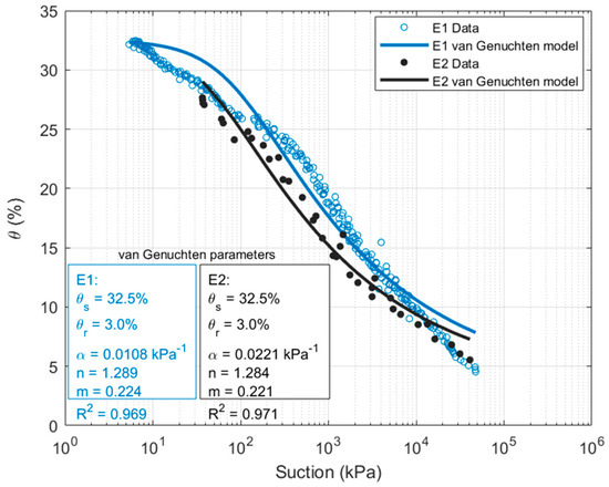 The SWRC of the sandy lean clay obtained from E1 and E2 tests under isothermal conditions fitted by van Genuchten model.