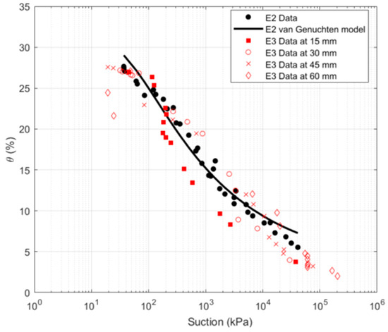A comparison between the SWRC obtained from isothermal (E2) and non-isothermal (E3) tests. The van Genuchten model is fitted to E2 data. The E3 data points are grouped by distance from soil–atmosphere interface.
