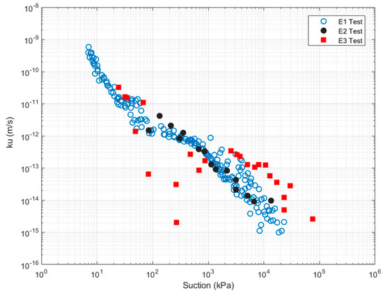 At high suctions, water flow is enhanced by vapor transfer. This phenomenon is particularly evident near the base of the column where the soil becomes very dry and the liquid phase nearly disappears. In this regime, vapor diffusion becomes the dominant mechanism for moisture transport. Combined liquid–vapor transport (E3 test) is more efficient than liquid-dominated flow (E1 and E2 tests). For suctions higher than 1000 kPa, ku for E3 test is significantly higher than ku for E1 and E2 tests.