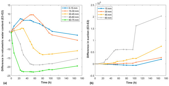 To understand the influence of thermal gradients on moisture redistribution within the soil column, the suction and water content profiles at different depths are first compared by calculating the differences in water content and suction between tests (E3−E2) over time (Figure 9). In the bottom of the columns, ∆θ60–75 and ∆θ45–60 are negative, showing that water content in test E3 decreases more rapidly than in test E2, due to the more intense evaporation induced by the heating. The consequent reduction in water content directly causes a faster increase in suction at 60 mm in depth. Moving upwards, the moisture dynamics change at the top of the column (∆θ0–15 and ∆θ15–30). The water content in test E3 remains higher than in the test E2 during the first 100 h, explained by the condensation of water vapor transported from the lower layers. This vapor accumulation, driven by the thermal gradient from the base to the top of the column, temporarily increases the water content, reducing the suction values, contrasting with test E2, where suction increases more rapidly at this zone due to faster drying. These differences in drying dynamics between E2 and E3 result in a deviation of the water retention curve, particularly in the upper zones.