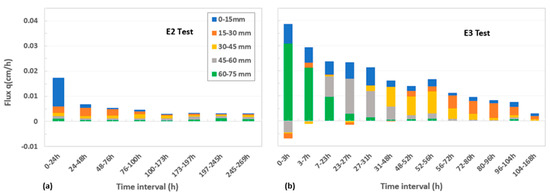 The non-isothermal test E3 allows for the observation of the effect of the vertical thermal gradient on the water flux. Temperatures increase gradually and stabilize after approximately 2 to 3 h, with an average of T60 = 30.5 °C and T15 = 20.8 °C (Figure 5c). This thermal gradient induces an energy disequilibrium within the soil, which tends to be balanced over time through an upward thermal flux. This thermal gradient does not only affect the distribution of heat, but also plays a role in the dynamics of water within the column. It leads to the appearance of a water flux (Figure 10a) from the early hours of the test, measurable in the first three intervals, while no flux is measured during the same period in the E2 test (Figure 10b). Thus, it promotes evaporation at the base of the column and the transport of water in the form of vapor to the upper layers, as mentioned by [13].