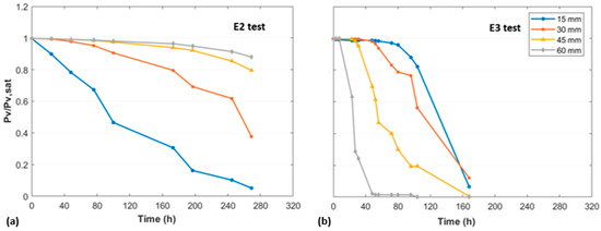 Evolution of vapor pressure ratio (Pv/Pv,sat) calculated using Equation (8) at different depths: (a) isothermal test (E2); (b) non-isothermal test (E3).
