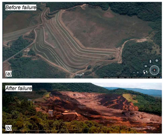 Feijão Dam 1 (a) looking north prior to failure (Google Earth via Robertson et al. [2]) and (b) after failure [2].