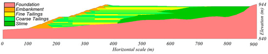 The user-defined constitutive models PM4SiltR (version 1.0) and PM4Sand (version 3.1) were used for all materials. PM4SiltR was used to model the fine tailings, slime, and foundation materials. PM4Sand was used to model the coarse tailings and embankment materials.
