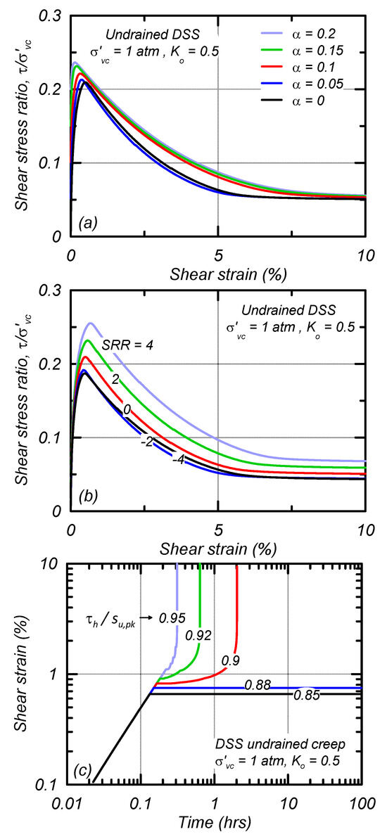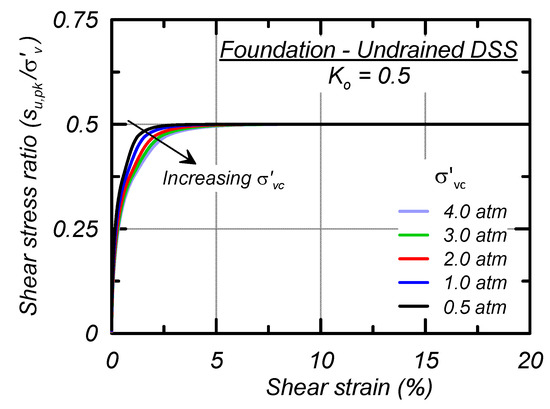 Stress–strain responses for single-element simulations of the foundation material subjected to undrained DSS loading after consolidation to σ′vc of 0.5, 1, 2, 3, and 4 atm and K0 of 0.5 are shown in Figure 7. Peak strength is mobilized at larger shear strains with increasing σ′vc and the su,pk/σ′vc is 0.5. Post-peak, the stress–strain response strain-hardens and does not lose strength, consistent with the characterized St of 1. The foundation Fp and FM parameters are 0 and as such the baseline calibration does not have the potential for creep to occur and the strength does not vary with the SRR.