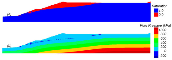 The initial seepage conditions were established first using an uncoupled analysis calibrated to produce results consistent with the piezometer data and seepage analysis results in the EPR. The EPR examined seepage under 2D and 3D conditions and accounted for seepage in partially saturated soils. The analyses did not consider partial saturation and instead treated soils above the water table as dry (S = 0%) and below the water table as fully saturated (S = 100%). This approach is in line with the goal of using approaches commonly used in forward design where the influence of partial saturation is often not considered. The FLAC seepage analyses did not account for seepage in partially saturated soils, such that material property adjustments were made to obtain consistency with the piezometer data and EPR results. The pore fluid tensile stress controls the height to which soils are saturated by a capillary rise above the phreatic surface; pore fluid tensile stresses of 29.4 kPa, 9.8 kPa, and 9.8 kPa were assigned to the fine tailings, coarse tailings, and embankment materials to produce capillary saturation to heights of 3.0 m, 1.0 m, and 1.0 m above the phreatic surface, respectively. Hydraulic conductivities of the materials were initially assigned the values in Table 1 and then iteratively adjusted to obtain a phreatic surface consistent with the EPR. The final calibrated analysis included two adjustments: (1) the isotropic conductivity of the foundation was reduced to 1 × 10−6 cm/s, and (2) the coarse tailings conductivity was made isotropic with a reduced conductivity of 1 × 10−5 cm/s. The results of the steady-state seepage analysis are illustrated in Figure 9, which shows saturation and pore pressure contours. The calibrated phreatic surface, like in the EPR, is high near the face of the dam due to a lack of internal drainage in the lower portion of the dam.