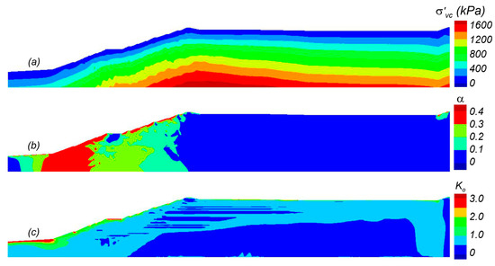 Initial static stress conditions at the end of consolidation: (a) vertical effective stress (σ′vc); (b) horizontal static shear stress ratio (α); and (c) at-rest lateral earth pressure coefficient (K0).