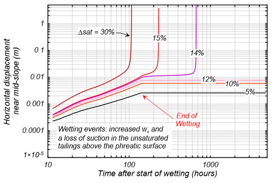 Horizontal deformations at the set-back versus time after the start of a wetting event causing an increase in the percent saturation (ΔS) and loss of suction in unsaturated tailings above the phreatic surface.
