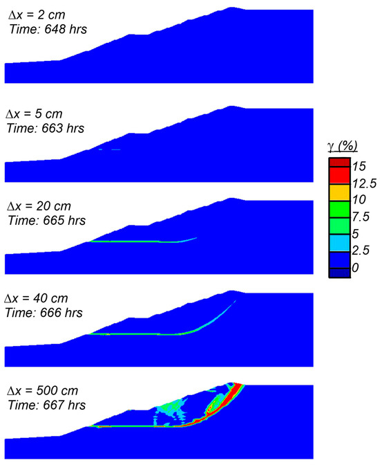 Shear strain contours (capped at 15%) at slope deformations of 2 cm, 5 cm, 20 cm, 40 cm, and 500 cm for the simulation with a ΔS = 14%.