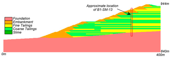 The fine tailings properties were characterized using data from the EPR and analysis of CPT data. The undrained strength (su) of the fine tailings was estimated through a combination of CPT data interpretation, laboratory test data, and empirical correlations for low plasticity silts and clays. CPT data digitized from the EPR is summarized in Figure 4 showing profiles of (a) qt; (b) total vertical stress (σv); (c) su,pk; (d) peak undrained strength ratio (su,pk/σ′vc); and (e) sensitivity (St). The su,pk was estimated using an Nkt of 9 based on correlations for brittle soils and Nkt values from other studies on tailings [19,20,21]. The St was estimated using sleeve friction correlations [22] and the limited number of field vane results showed a St of approximately 4. The su,pk/σ′v of the fine tailings was characterized as 0.21, based on the 50th percentile of the values in Figure 4, with a St of 4 for DSS loading. Larger Nkt values that are often used for less brittle, sedimentary materials (~12–14) would result in a su,pk/σ′vc of approximately 0.15 to 0.17, which is lower than expected for most low plasticity fine-grained materials. The small-strain stiffness was taken as characterized in the EPR based on dilatometer data. The fine tailings were characterized as having an average dry density of 1898 kg/m3, porosity of 0.59, plasticity index (PI) of 4, liquid limit (LL) of 21, fines content (FC) of 71%, and USCS classification of low plasticity silt (ML). The vertical (ky) and horizontal (kh) hydraulic conductivities were taken as 2.0 × 10−6 and 1.0 × 10−5 cm/s, respectively.