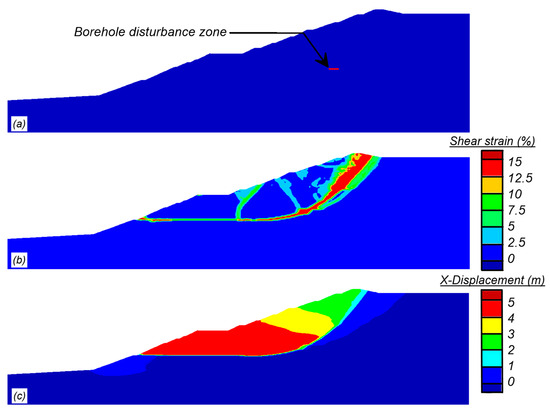 Results of simulation of borehole disturbance causing slope instability: (a) borehole disturbance zone; (b) shear strain (capped at 15%); and (c) horizontal displacement.