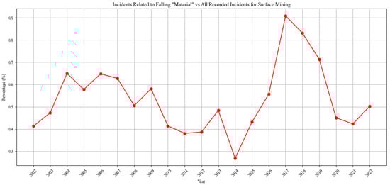 In recent years, the percentage of mining injuries caused by falling material has increased compared to the total number of recorded mining incidents (Figure 2). These findings emphasize the importance of prioritizing efforts to understand and mitigate rockfall hazards.