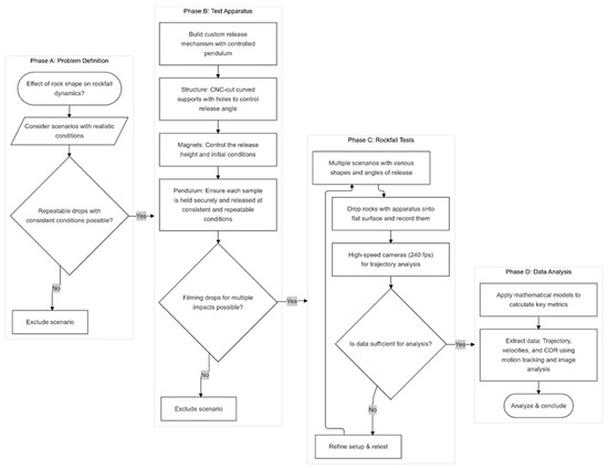 The process begins with Phase A, Problem Definition, where the research question is established: how do rock shape and release angle impact rockfall dynamics? Scenarios are considered with realistic conditions, and scenarios lacking repeatable, consistent testing conditions are excluded.