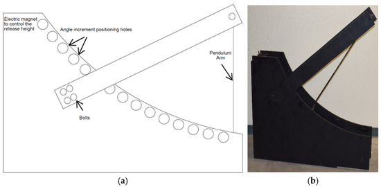 The core of the testing apparatus is the pendulum arm, a mechanism designed to control the release of rock samples with high precision. The pendulum arm incorporates an electromagnet that holds it securely in place before release, ensuring consistent initial heights for all experiments. The arm’s motion is restricted by a stop bar, which dictates the angle of release. This stop bar can be positioned at various predefined angles, thanks to CNC-machined curved wooden supports with holes drilled at 5-degree intervals. The precise placement of the stop bar enables fine-tuned control of the pendulum’s release conditions, a critical factor in replicating impact scenarios (Figure 4 and Figure 5).