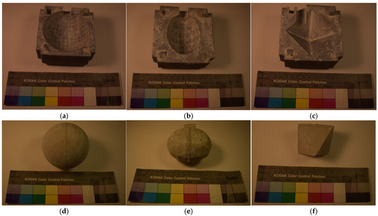 (a–c) The 3D-printed molds for spherical, ellipsoidal, and octahedral rock shapes, respectively; (d–f) the corresponding concrete samples cast from the molds, used in the tests.