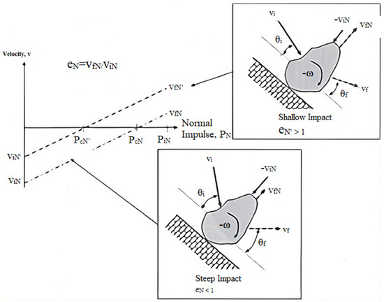 The vertical component of the rock’s velocity after an impact vfN and before an impact viN determines the COR, which indicates the proportion of kinetic energy retained or lost during impact. A COR value of 1 represents a perfectly elastic collision, while 0 indicates a perfectly inelastic collision. However, under certain conditions, such as specific impact angles or rock geometries, the COR can exceed 1 when the post-impact speed in one direction surpasses the pre-impact speed. Figure 7 shows changes in the normal velocity during impact for two identical, non-spherical, and eccentric impacts concerning mass and impact translational velocity (impulse). The only difference between the two is the impact angle (θi). The dashed lines show the change in vN from a negative value acting toward the slope at t = i to 0 at the impact, and then a positive velocity acting away from the slope at t = f [32].