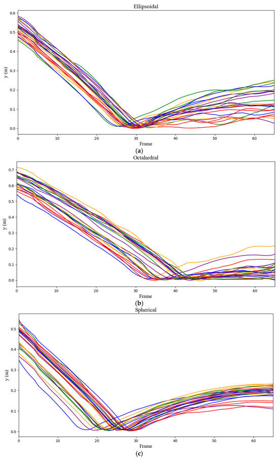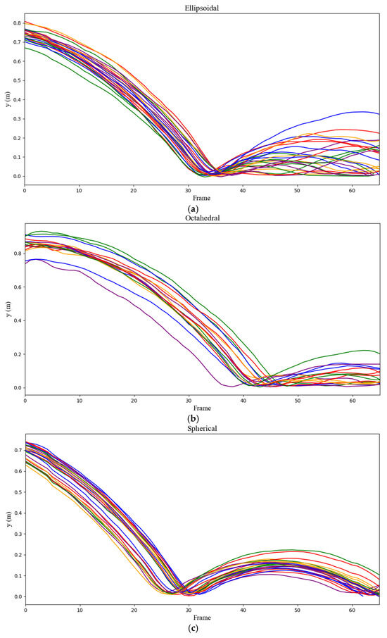 The trajectories for (a) ellipsoidal, (b) octahedral, and (c) spherical rocks at the release angle of 30°.