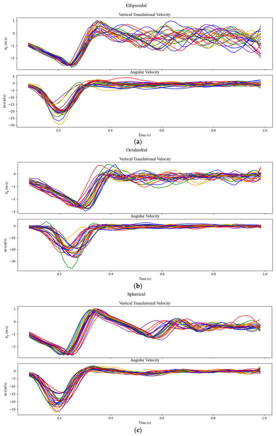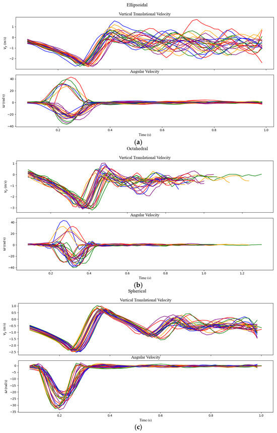 For the ellipsoidal samples, angular velocity fluctuates between topspin (negative values) and backspin (positive values), leading to a broad range in vertical translational velocity, from −2 m/s at impact to 1.5–2.5 m/s at rebound. This dual spin behavior contributes to the erratic rebound motion observed. Octahedral rocks exhibit a similar variation in spin, but with an even wider range of velocities, from −3 m/s at impact to −0.5 to 1 m/s at rebound, reflecting the irregularity of their shape and the unpredictability of their motion. In contrast, spherical samples show more consistent behavior, with mostly topspin and vertical velocities ranging from −2.5 m/s to 1 m/s, indicating a stable energy transfer during rebound (Figure 11).
