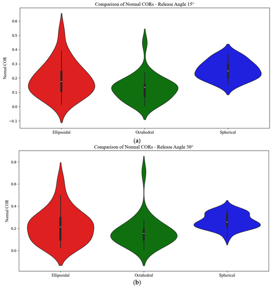 The normal COR distribution during the first impact for different shapes at the release angles of (a) 15° and (b) 30°.